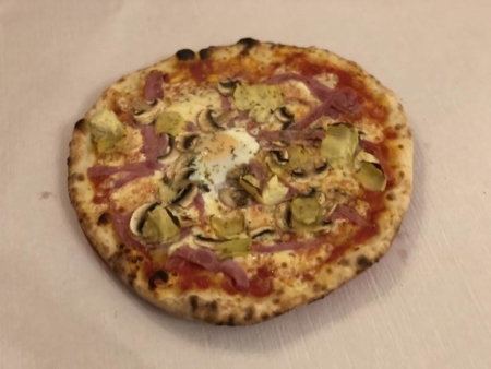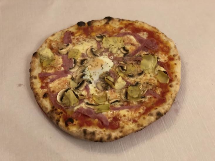 Tomate, mozzarella, jambon d’épaule, champignons, artichauts, oeuf, origan.